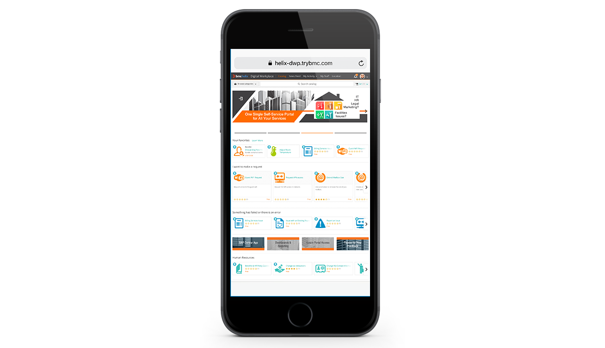 従業員は、数回タップするだけで、1つのサービスカタログから新しいコンピュータの注文や最新のモバイル旅行アプリを入手することができます。IT、HR、調達などの部門によるリクエストとサービスを一元的に定義して管理することで、組織全体でこれまでになく簡単にサービスが選べるようになります。