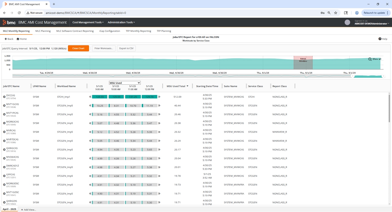 最先端のインターフェースがコストと利用率の指標を完全かつ簡潔に表示し、メインフレームライセンスコスト(MLC)に寄与するピークリソース使用の主要ドライバーを含む